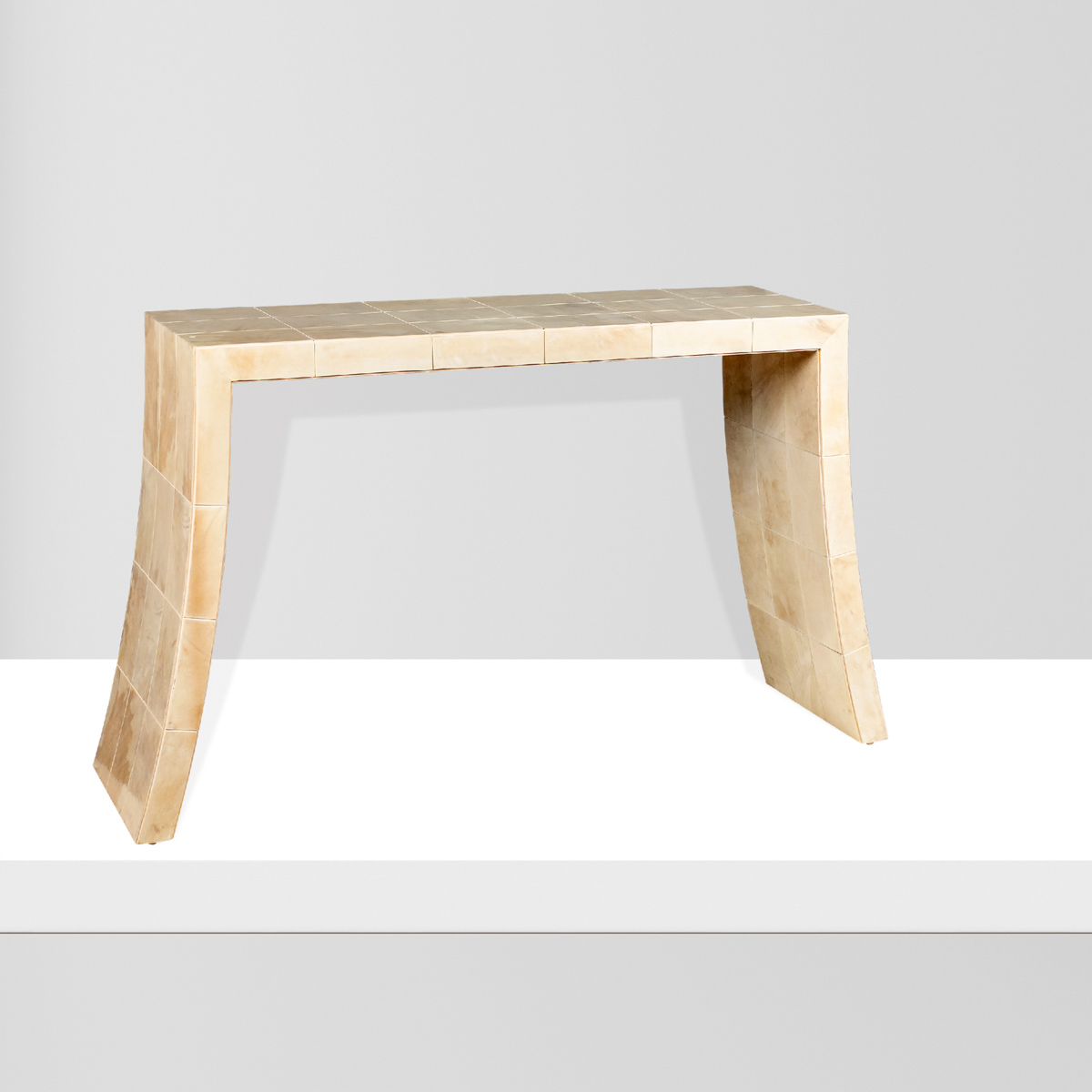 Lotto 383 | Manifattura franceseXX Sec.81x132x38 cm.console in legno rivestita in pergamena