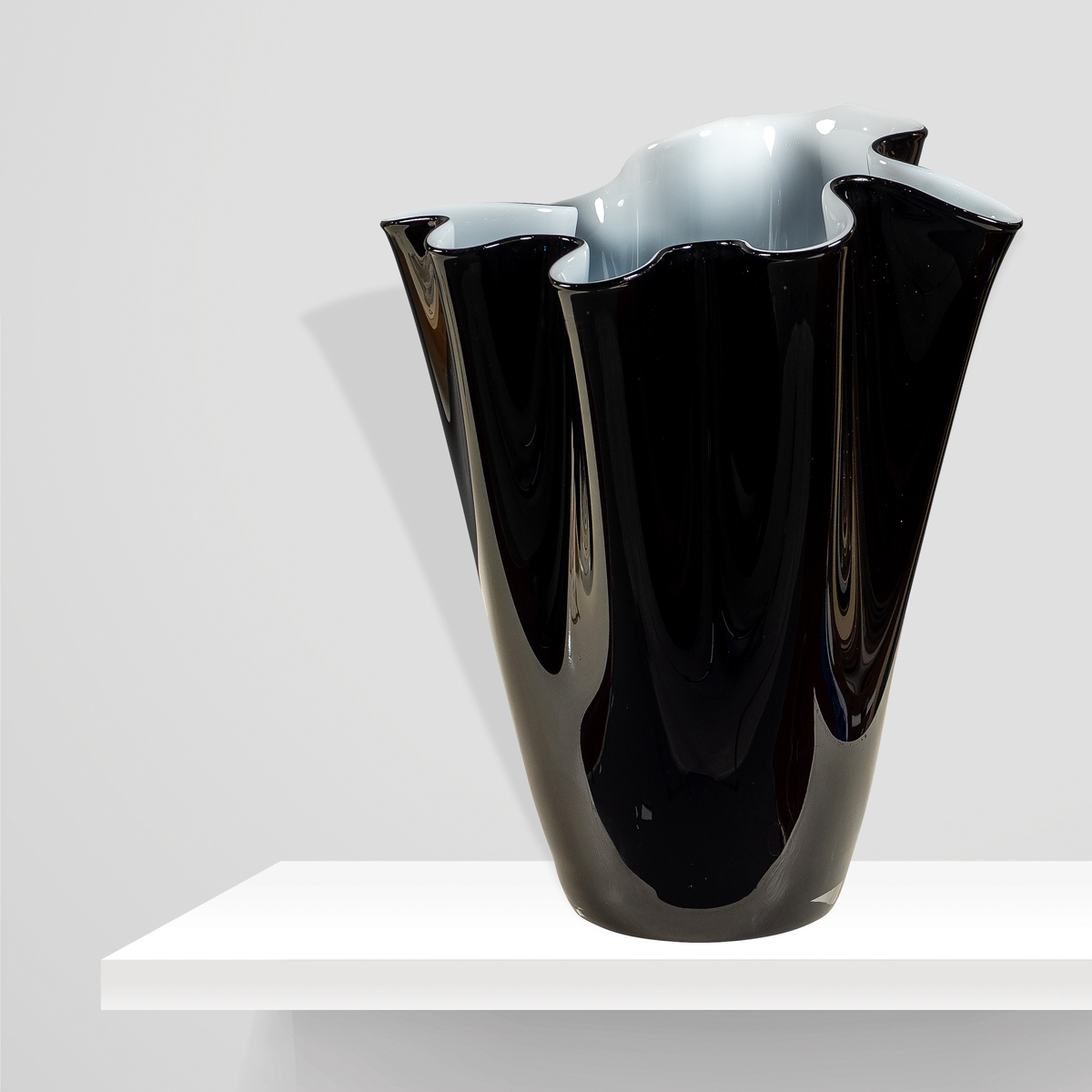 Manifattura italianaanni 2000h. 39,5 cm.vaso a fazzoletto in vetro nero, interno in opalina bianca