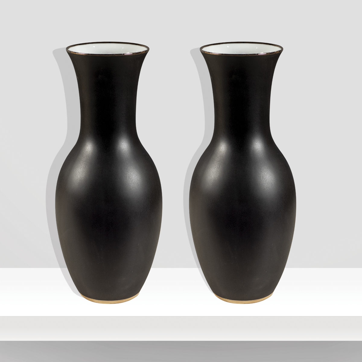 Richard Ginori (2)Italia, XX Sec.h. 45-d. 14 cm.coppia di vasi in porcellana opaca nera, interno bianco lucido, profili in oro, marchio sotto la base