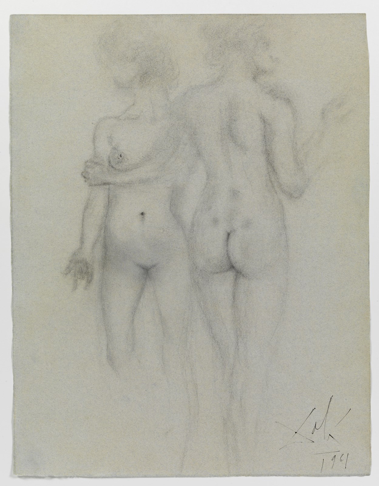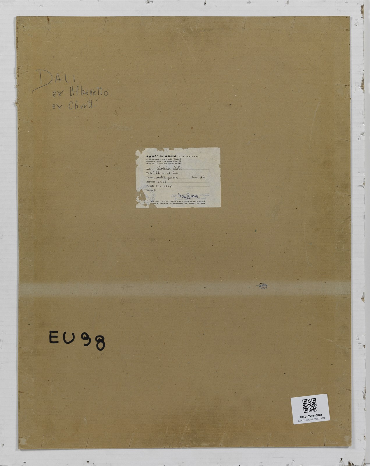 DALI' SALVADOR (1904 - 1989) Coppia di amanti. 1961. Matita grassa su carta. Cm 48,00 x 61,90. Firma e anno in basso a destra. Al retro cartiglio S. Erasmo, Milano. Opera archiviata presso la Fundacio Gala - Salvador Dalì come da documentazione fotografica allegata all'opera riportante il relativo numero d'inventario. . Cornice presente