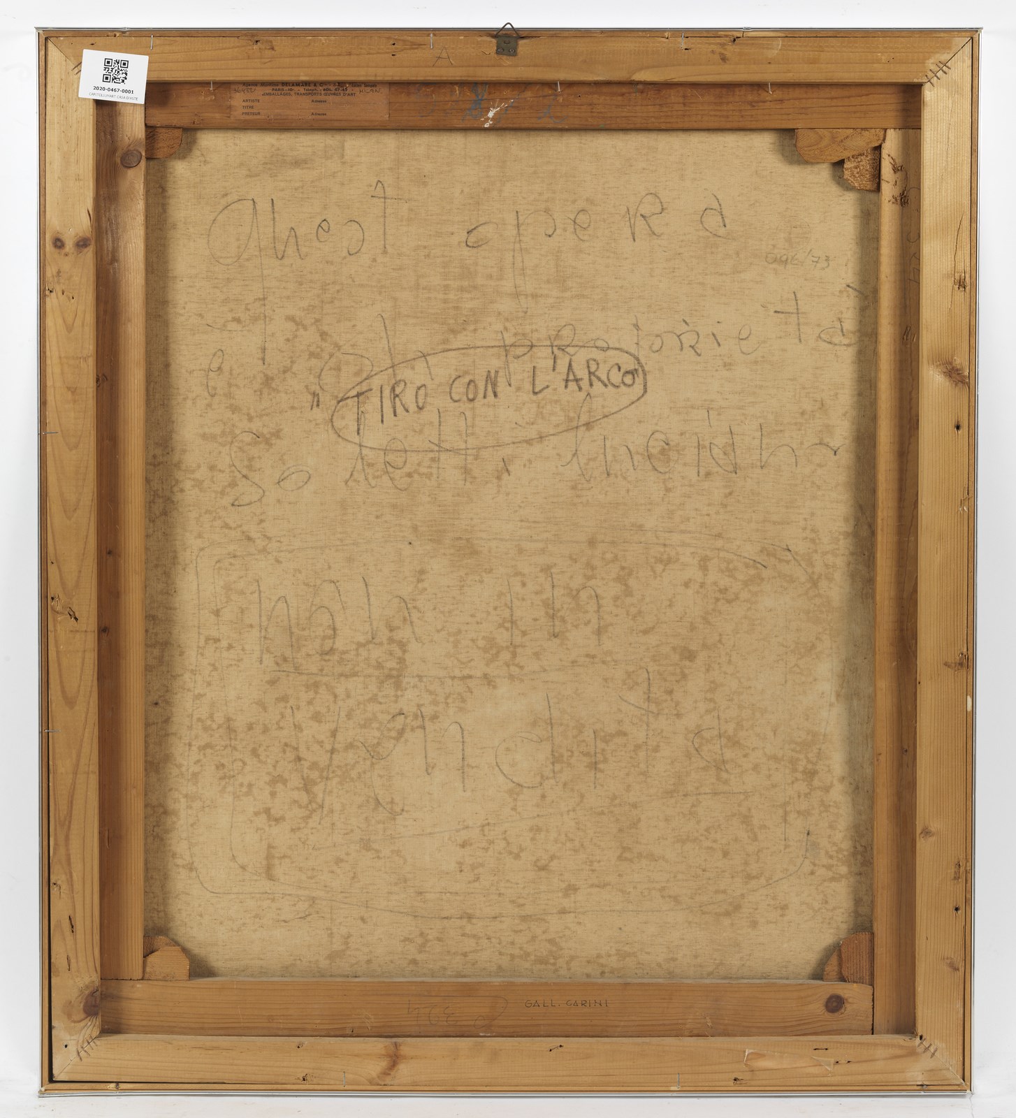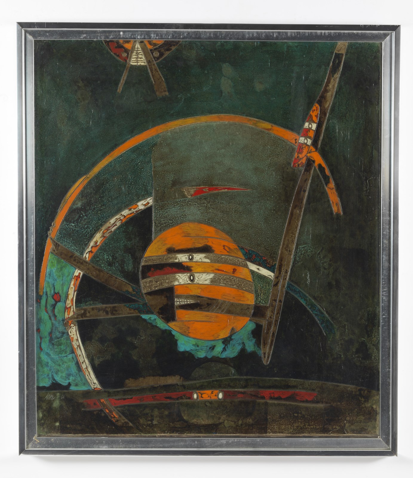 DOVA GIANNI (1925 - 1991) Tiro con l'arco. 1962. Olio su tela . Cm 70,00 x 80,00. Firma e anno in basso a sinistra. Titolo al retro. Opera archiviata presso l'Archivio delle opere di Gianni Dova come da documentazione fotografica allegata all'opera riportante il relativo numero d'inventario.