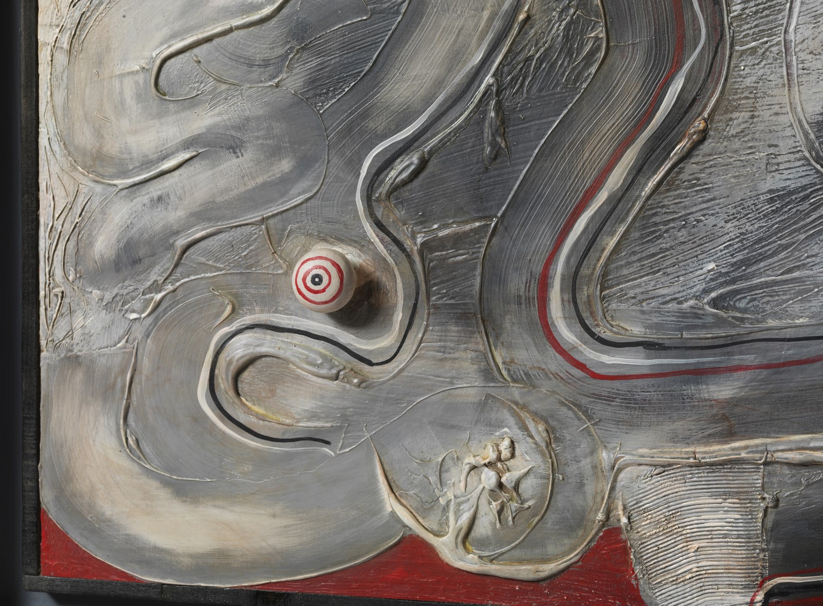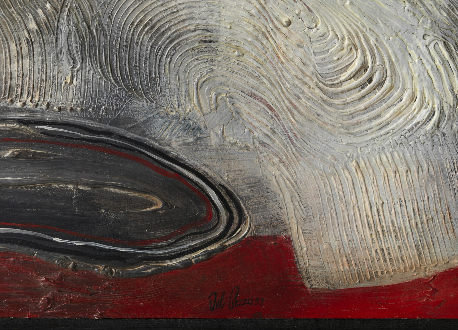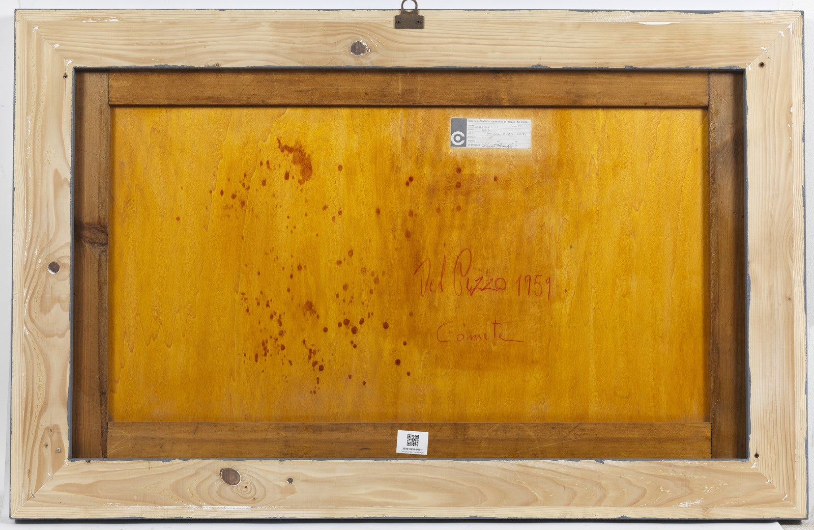 DEL PEZZO LUCIO (n. 1933) Comete. 1959. Tecnica mista su tavola. Cm 125,00 x 75,00. Firma e anno in basso a destra. Al retro titolo, firma, anno e cartiglio descrittivo Galleria Arte Centro, Milano. Cornice presente