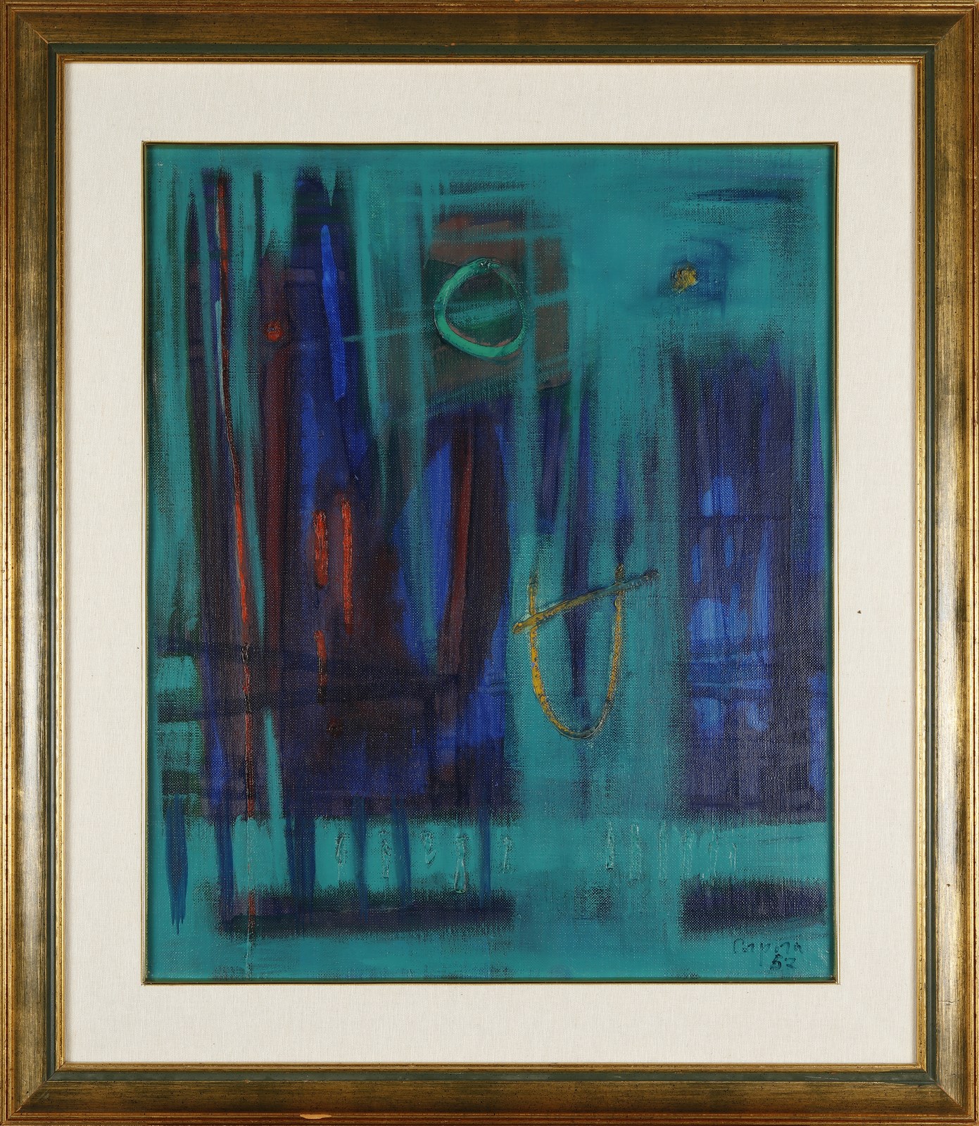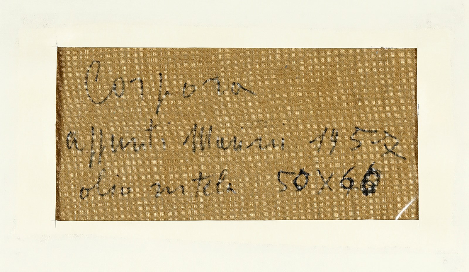 CORPORA ANTONIO (1909 - 2004) Appunti marini. 1957. Olio su tela . Cm 50,00 x 60,00. Firma e anno in basso a destra. Al retro titolo, firma e anno. Autentica del Dott. Giovanni Di Summa come da documentazione fotografica allegata all'opera riportante il relativo numero d'inventario. Pubblicazione: Catalogo Generale delle opere di Antonio Corpora, Volume I, Giovanni Di Summa, Roma, 2004, pag. 112. Cornice presente