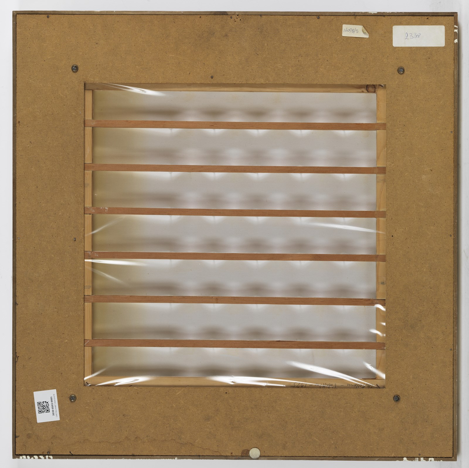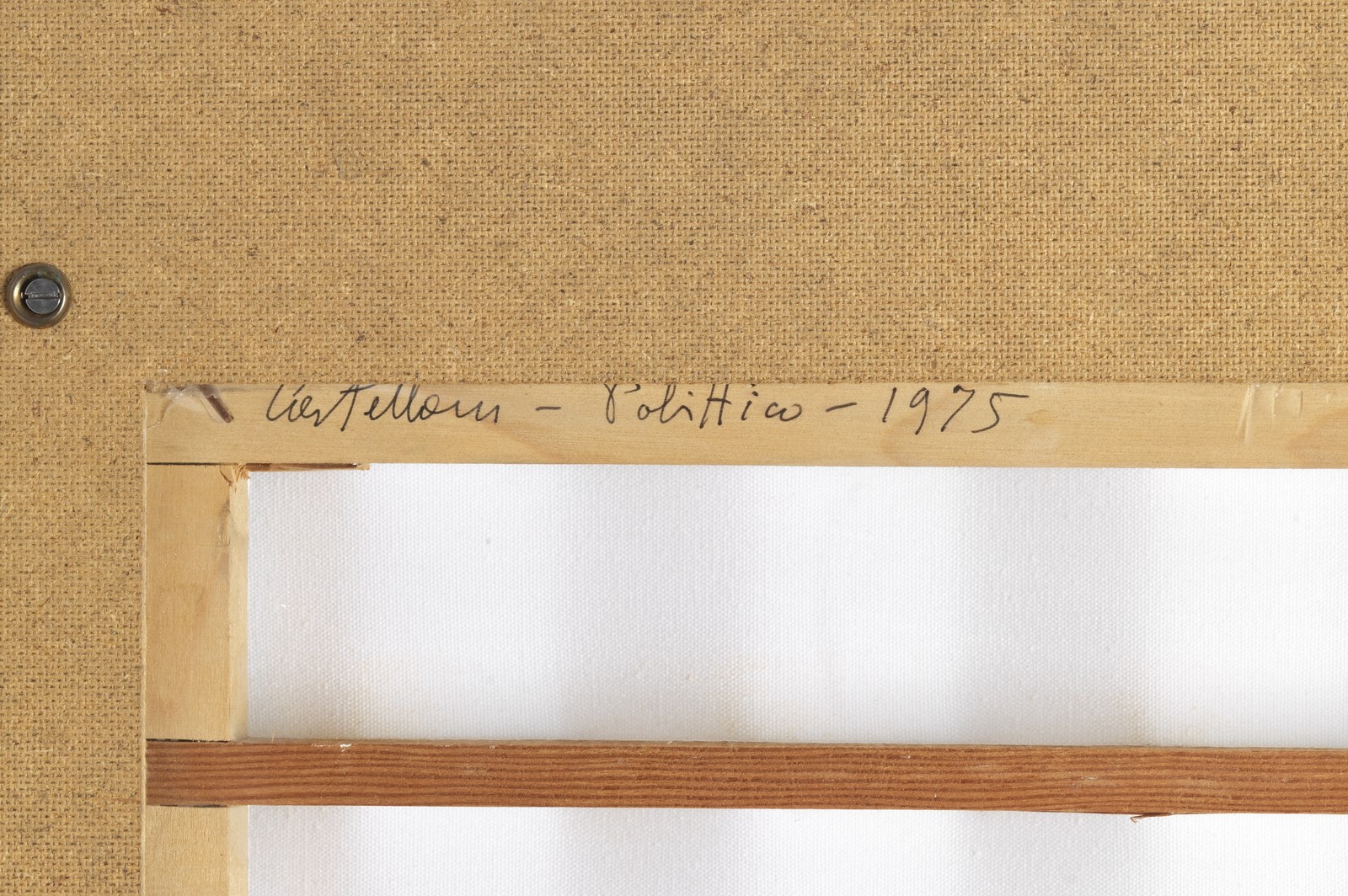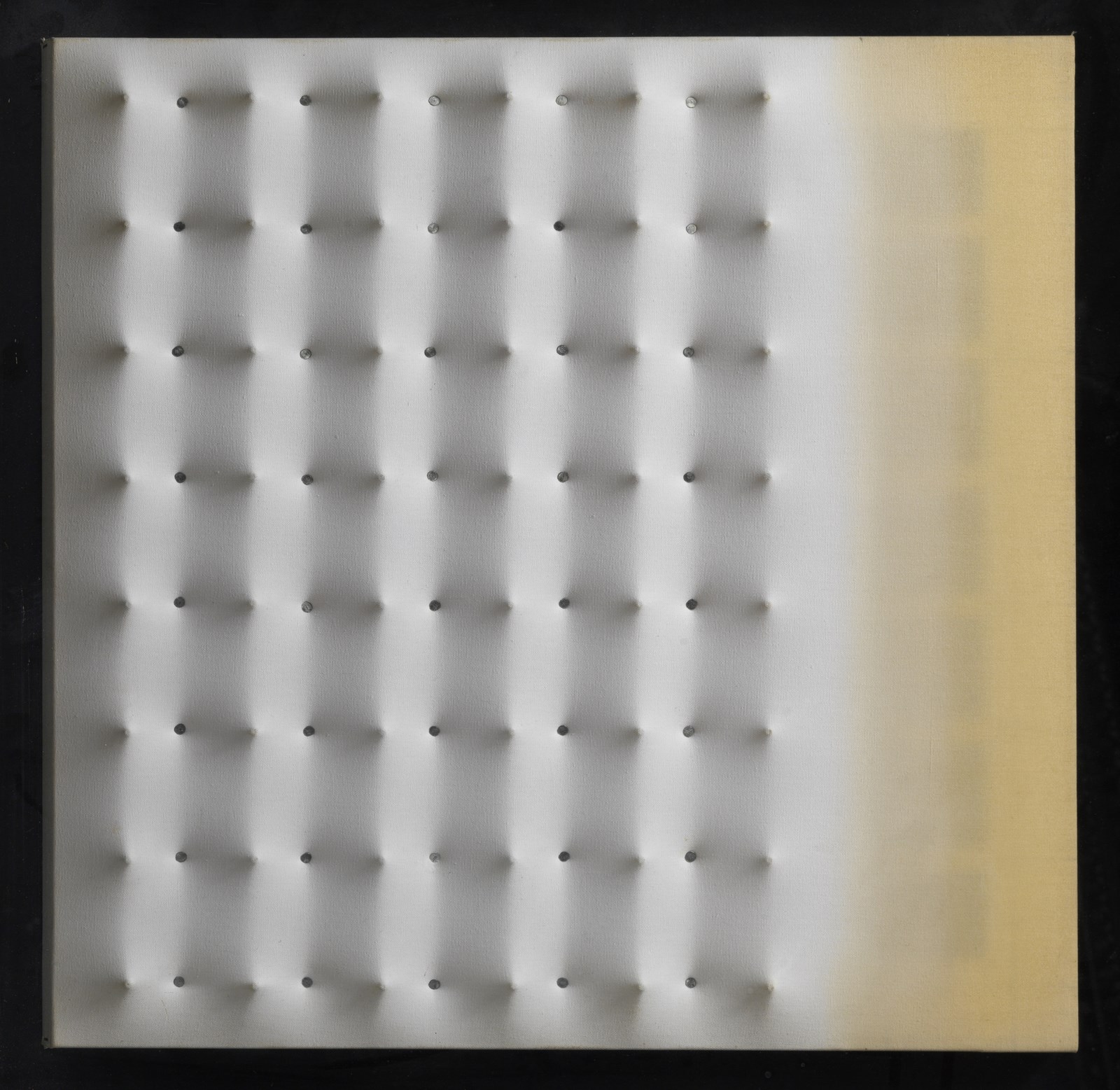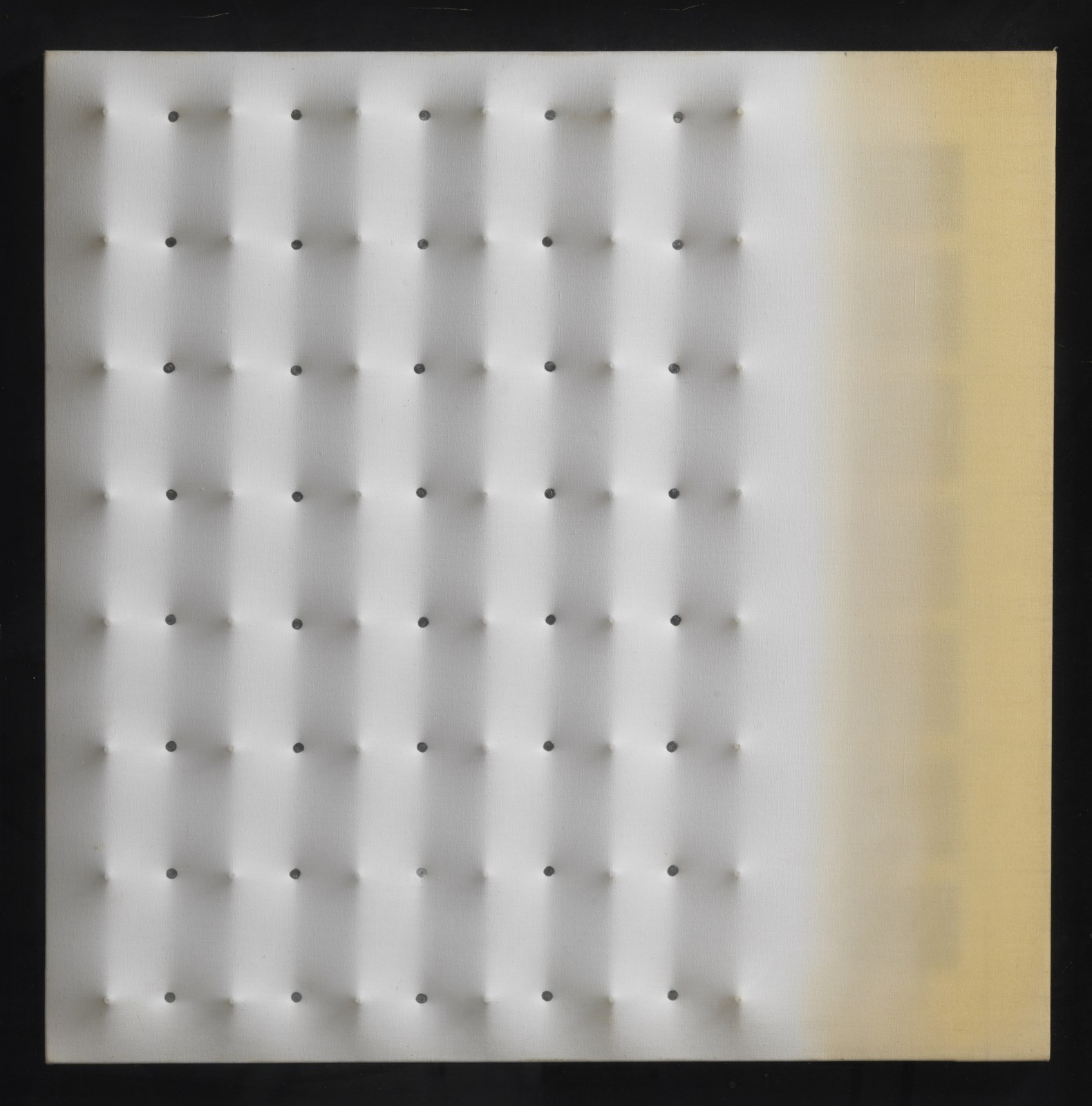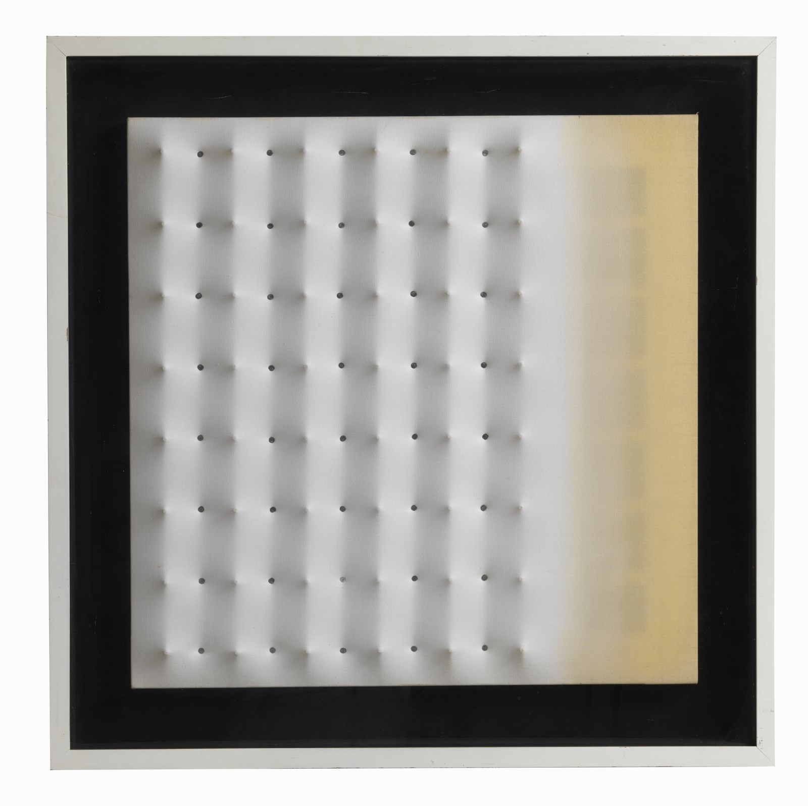 CASTELLANI ENRICO (1930 - 2017) Polittico. 1975. Acrilico e resina poliestere su tela. Cm 60,00 x 60,00. Firma, titolo e anno al retro sul telaio. Opera archiviata presso l'Archivio Castellani, Milano come da documentazione fotografica allegata all'opera riportante il relativo numero d'inventario (copia fotostatica). Il pezzo è un frammento di un polittico disperso, costituito da 9 elementi, il cui perimetro totale era caratterizzato da quattro fasce gialle trattate con resina e la cui parte centrale si presentava come una delle sue classiche tele a rilievo dipinte di colore bianco. Gli 8 elementi che si collocavano attorno alla tela centrale sono quindi caratterizzati dalla presenza di uno o due lati trattati a resina a seconda di dove fossero disposti all'interno della composizione. Nel caso dell'opera presentata si tratta della tela che occupava la parte centrale di sinistra e quindi l'intervento è presente solo su tale lato. Tutti gli elementi del polittico sono stati archiviati singolarmente come frammenti della composizione ormai dispersa.
