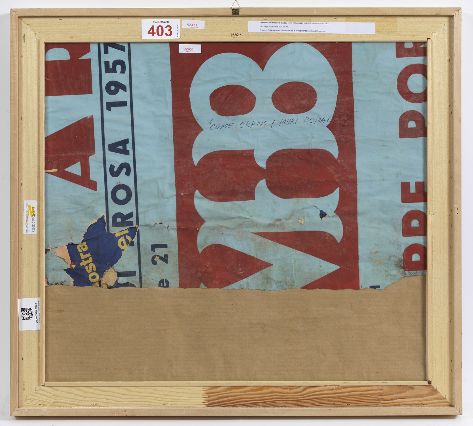ROTELLA MIMMO (1918 - 2006) Muro romano con impronte di pneumatici. 1955. Affiche. Cm 67,00 x 60,00. Firma e data in basso a destra. Provenienza: Galleria Marconi, Milano. Certificato di autenticità dello Studio Marconi, Milano. Pubblicazione: Sam Hunter, Rotella. Décollages 1954-1964, Electa, Milano, 1986, p. 103, n. 81. (lotto con provenienza extra ue soggetto al 10% di tasse sull'importazione da aggiungere alle commissioni dell'acquirente)