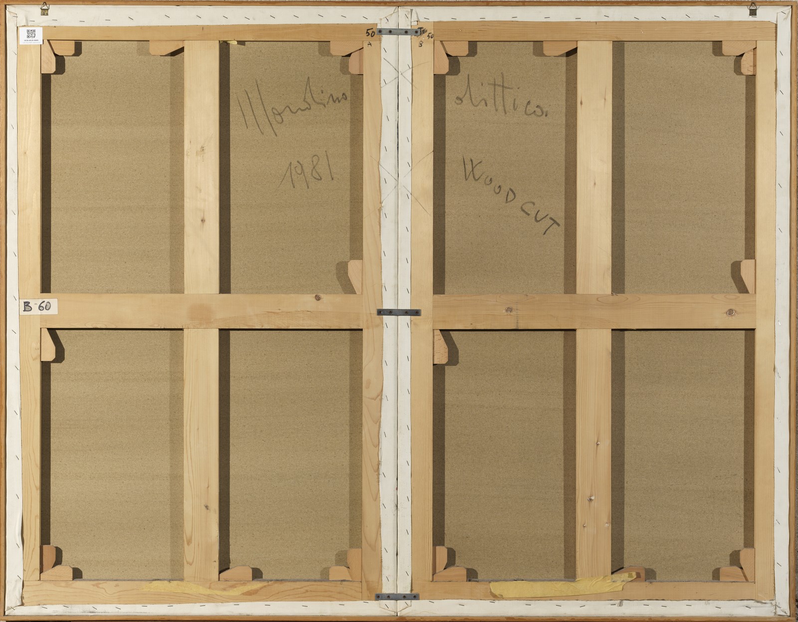 MONDINO ALDO (1938 - 2005) Wood cut. 1981. Acrilico su tela. Cm 200,00 x 140,00. Titolo in basso al centro. Al retro titolo, firma e anno. Autentica dell'artista su fotografia.