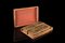 Scatola porta fiches in legno laccato rosso decorato a chinoiserie. Interno con quattro porta fiches decorate con personaggi orientali (cm 20x15x5,5) (difetti e mancanze)