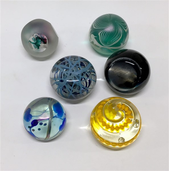 Gruppo di sei presse-papiers di diverso decoro, alcuni firmati (lievi difetti)