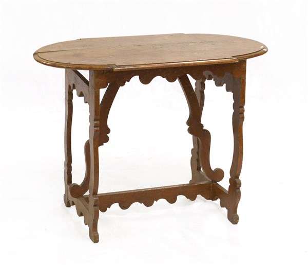 Antico tavolino in noce con piano, gambe e traverse sagomate (cm 93x70x57) (dif