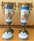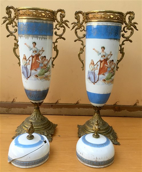 Manifattura della prima metà del secolo XX, coppia di vasi con coperchio in porcellana decorata in policromia con suonatrici, montati in metallo dorato (h cm 53)(difetti, restauri e mancanze)