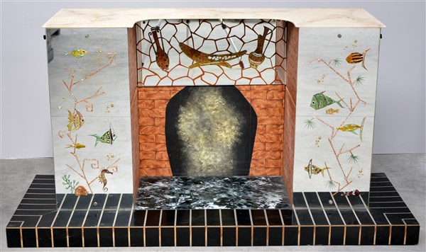 Mobile bar eclettico con struttura a finto camino, due sportelli laterali e piano in onice (cm 152x80x40) (difetti e mancanze)