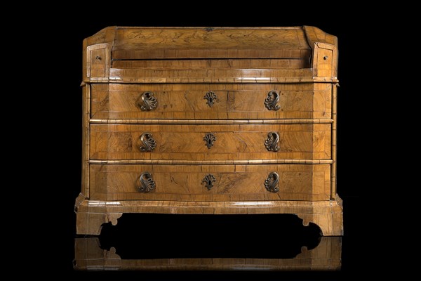 Antica ribalta di forma mossa lastronata in radica e filettata. Fronte a tre cassetti, due cassetti laterali e anta ribaltabile celante vano e cassettini (cm 133x103x65) (difetti)