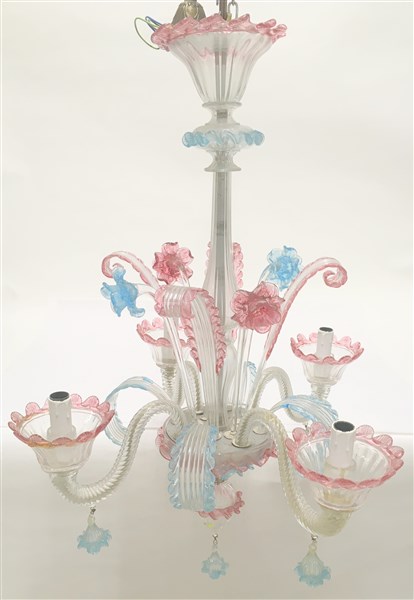 Lampadario in vetro di Murano decorato a foglie e fiori nei toni dell'azzurro e del rosso (h. cm 80) (difetti)