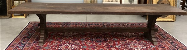Grande tavolo di forma rettangolare con montanti sagomati riuniti da traversa (cm 350x78x84) (difetti)
