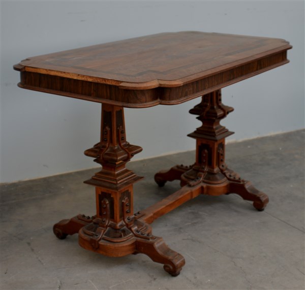 Tavolino lastronato in noce con piano sagomato poggiante su gambe squadrate riunite da traversa. Secolo XIX (cm 113x75x70) (difetti)