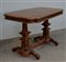 Tavolino lastronato in noce con piano sagomato poggiante su gambe squadrate riu