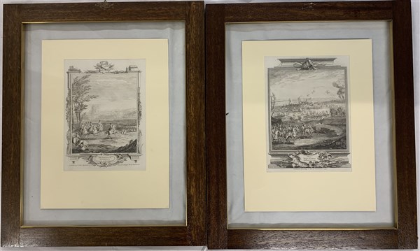 Lotto composto da dieci incisioni raffiguranti battaglie del XVIII secolo inserite in riquadri con trofei d'arme sulla cimase e sul fianco.