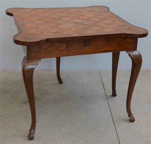 Tavolino da gioco a libro lastronato in noce e radica di noce, piano sagomato lastronato all'interno a riquadri, cassetto nella fascia, gambe sagomate e radicate, secolo XVIII (cm 92x79x46) (difetti, restauri e mancanze)