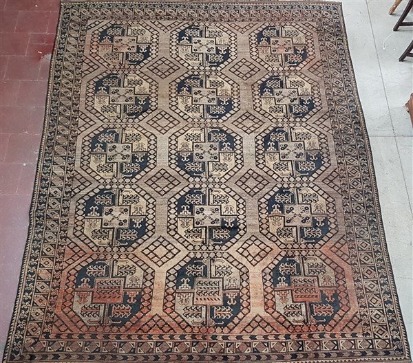 Decoro a zampa di elefante nei toni del blu e crema su fondo nocciola. All'interno dei Gul il simbolo di Tamerlane: il trifoglio. (difetti e rapature) (cm 310x235)