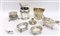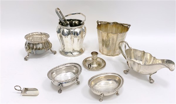 Lotto composto da due cestelli porta ghiaccio di cui uno con pinza, una salsiera, una bugia, tre zuccheriere e una paletta per zucchero in argento (g tot. 1840 ca.) (difetti)