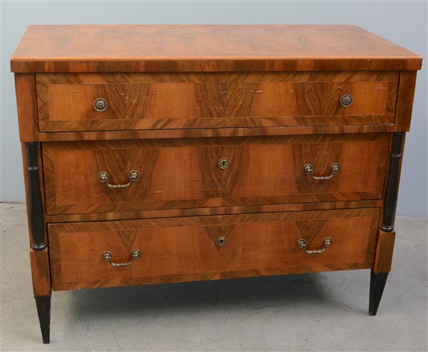 Comò a tre cassetti di cui quello superiore a scrittoio con piano a slittamento celante vani e cassettini, semicolonne e piedi ebanizzati (cm 125x98x59) (difetti)