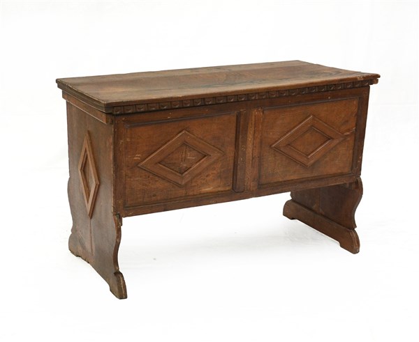 Madia con piano apribile e fronte decorato a motivi geometrici, gambe sagomate (cm 120x77x60) (difetti)
