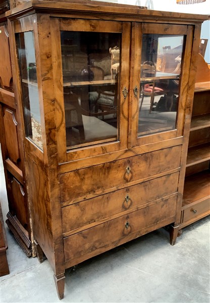 Mobile vetrina in noce con tre cassetti e due ante a vetri. Piedi rastremati (c