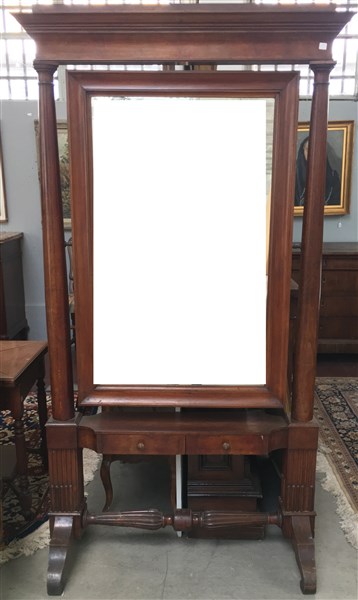 Psiche da terra in noce a due cassettini in linea nella fascia, montanti a colonna tornita, gambe sagomate riunite da traversa tornita e scanalata, secolo XIX (cm 110x198x53) (difetti, restauri e mancanze)