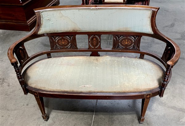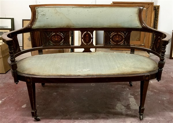 Divanetto con schienale traforato decorato da cartelle intarsiate a motivi flor