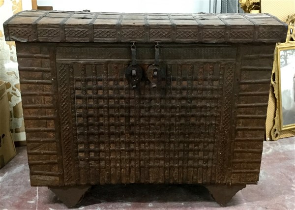Cassone in legno con coperchio curvo, fronte rivestito in metallo decorato a mo