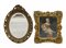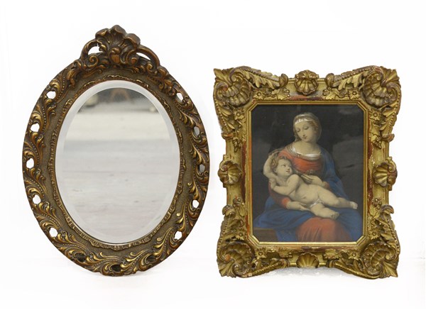 Lotto composto da due cornici in legno e pastiglia dorata una contenente una riproduzione, l'altra uno specchio (misure diverse) (difetti)