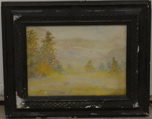 Lotto 453 | Firma indecifrata "Paesaggio con alberi" tecnica mista su cartoncino (cm 23x30)