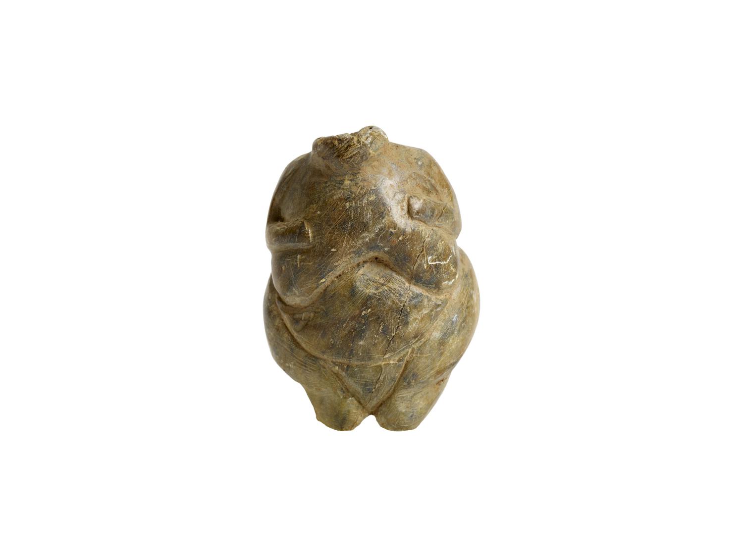 Statuetta di dea madre steatopigia stante con testa sferica senza indicazione del volto, braccia sopra i grandi seni, ampio ventre prominente, gambe corte e tozze, natiche in evidenza