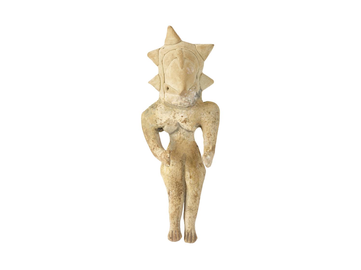 Figura femminile stilizzata e nuda, in posizione seduta con elaborata acconciatura dei capelli, naso a becco, piccolissimi occhi, braccia protese in avanti, seni evidenziati