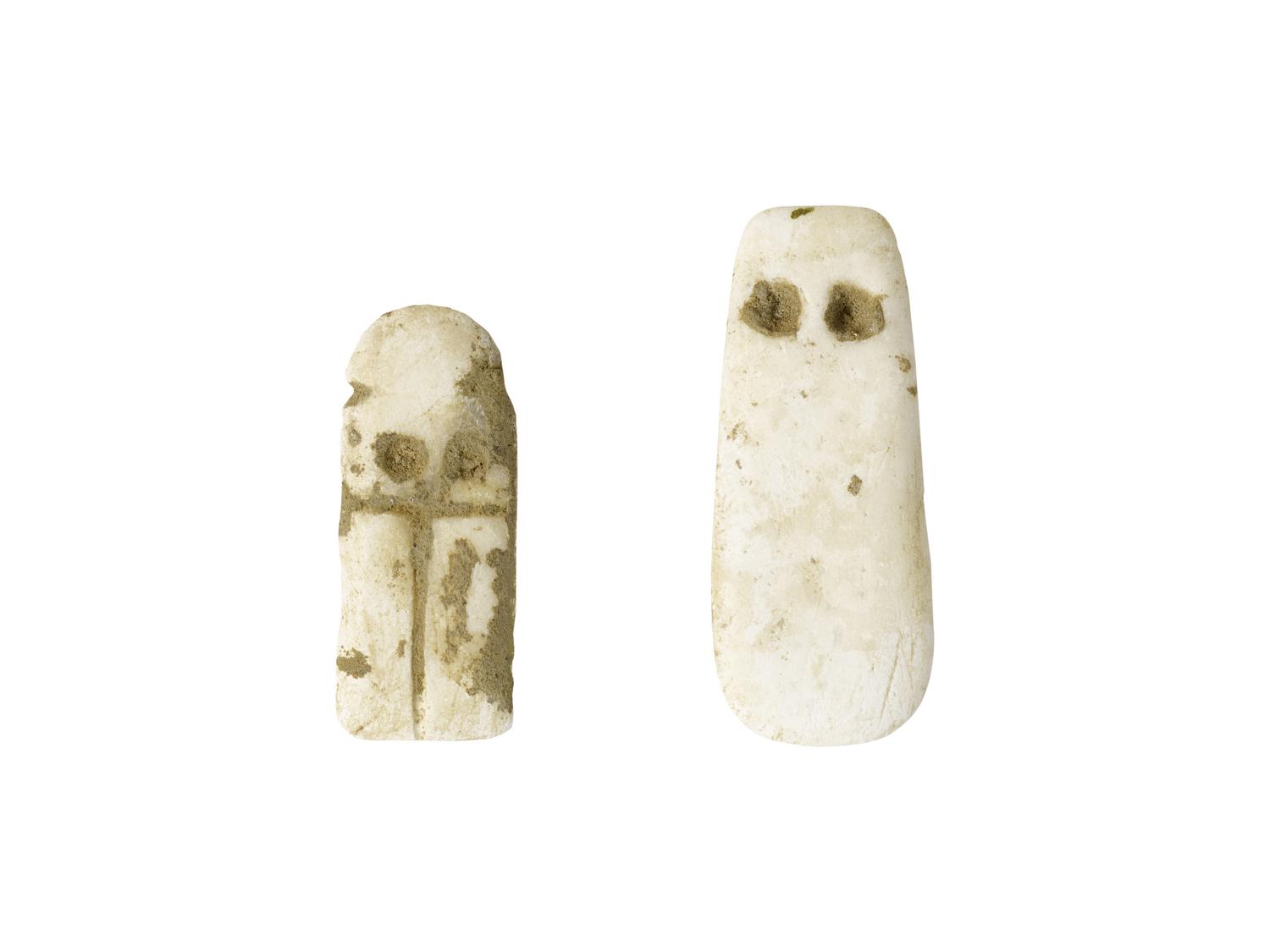 Due idoli raffiguranti una forma umana fortemente stilizzata, su una lastrina rettangolare piatta in cui sono evidenziati solo gli occhi; (2)