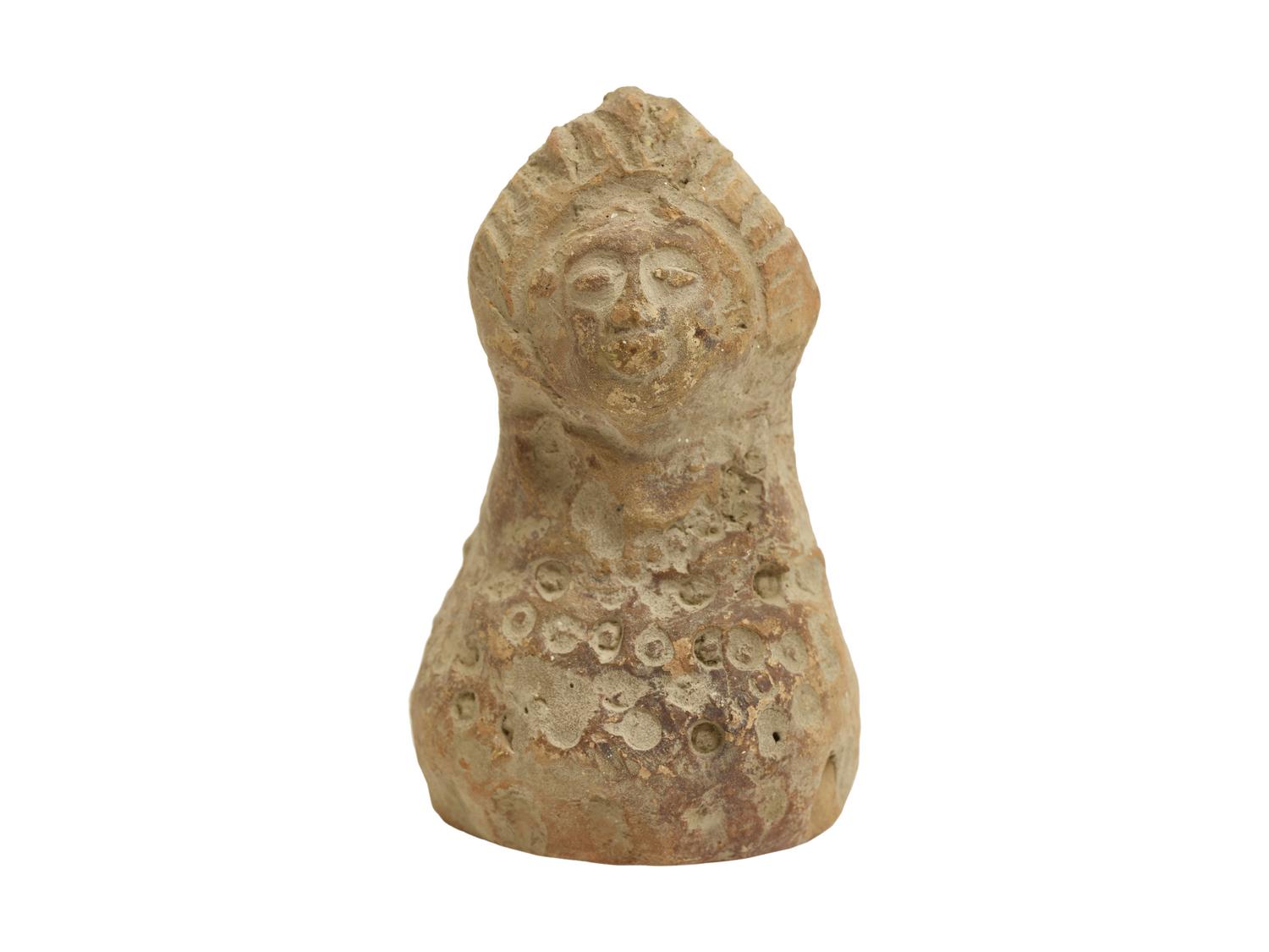 Divinità femminile raffigurata a mezzo busto con alta pettinatura e grande collana che le copre il petto