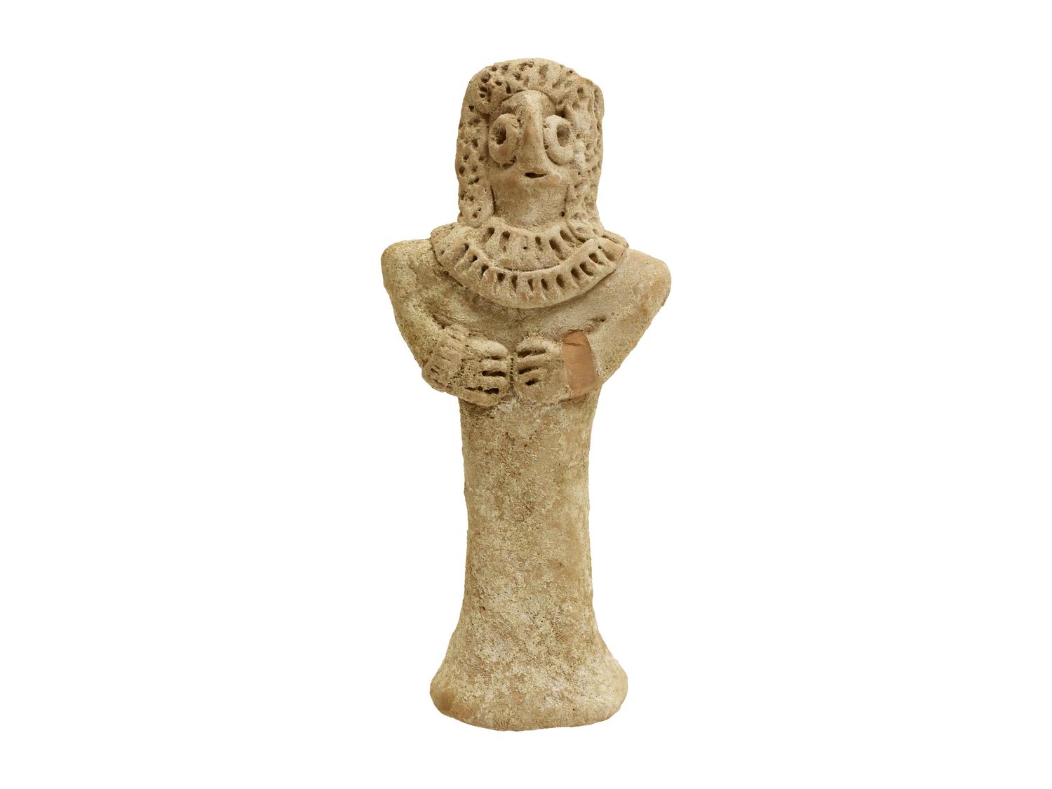 Divinità femminile stante in posizione frontale con ricca capigliatura a boccoli, ricadente sulle spalle; naso a becco, occhi applicati, ampia collana doppia sul petto, braccia portate sul ventre con armille, lunga veste che arriva fino al suolo; piccola presa sul dorso