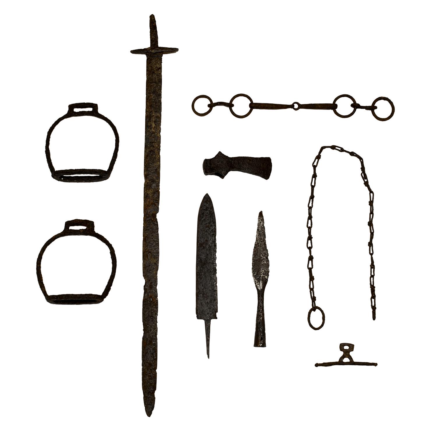 Spada, pugnale, ascia, punta di lancia, morso da cavallo, staffe e catena del cuore (8)