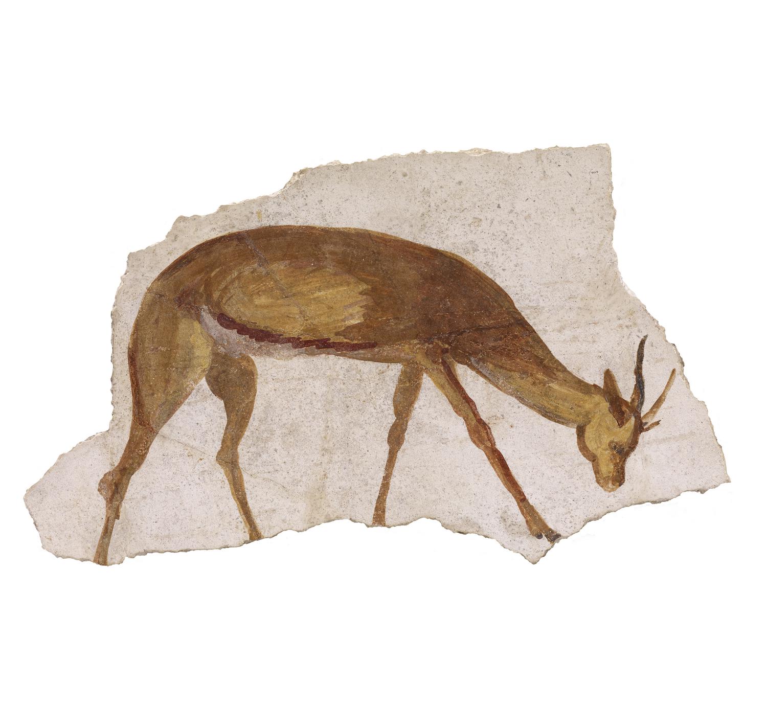Frammento di affresco parietale pertinente ad una composizione di maggiori dimensioni, raffigurante su un fondo bianco un cerbiatto gradiente a sinistra, in atto di pascolare con la testa dalle corna sottili abbassata