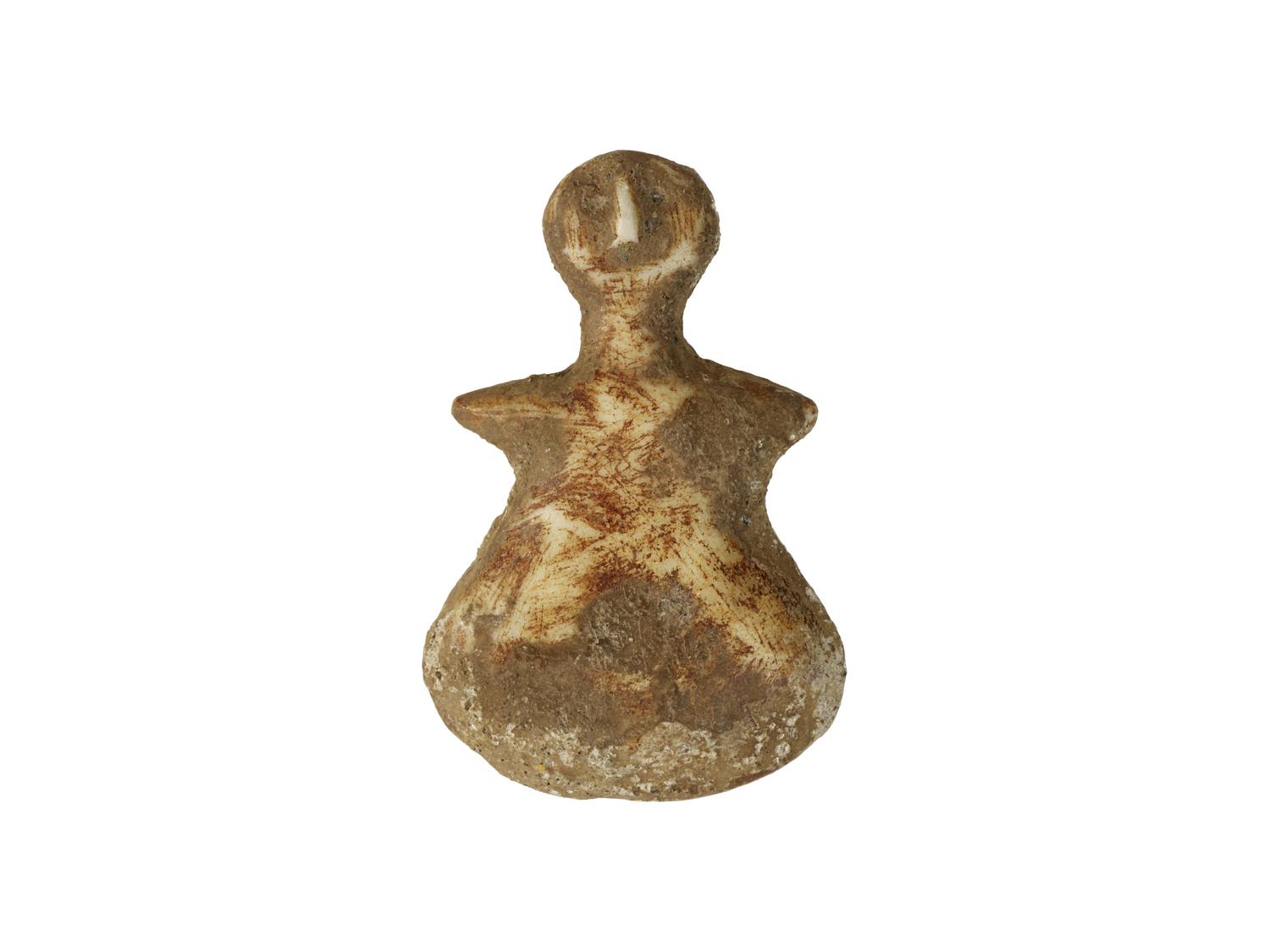Idolo schematico del tipo Beycesultan, con testa rotonda con indicazione di occhi e naso, braccia ridotte a due appendici triangolari, corpo a violino