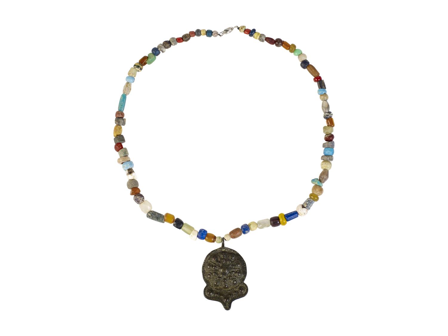 Collana costituita da vaghi di varie forme e colori in pasta vitrea con grande pendente ad umbone in bronzo decorato a coppelle in rilievo