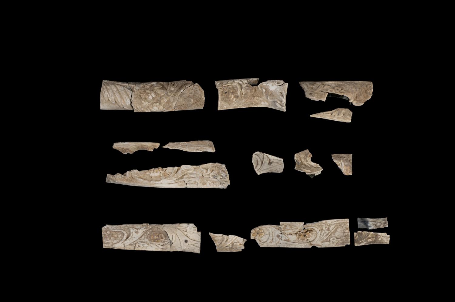 Gruppo di quindici frammenti in avorio ed osso, intagliati a motivi fitomorfi e con piccoli fiori a quattro petali e parzialmente ricoperti in foglia d'oro, pertinenti probabilmente al rivestimento di un cofanetto