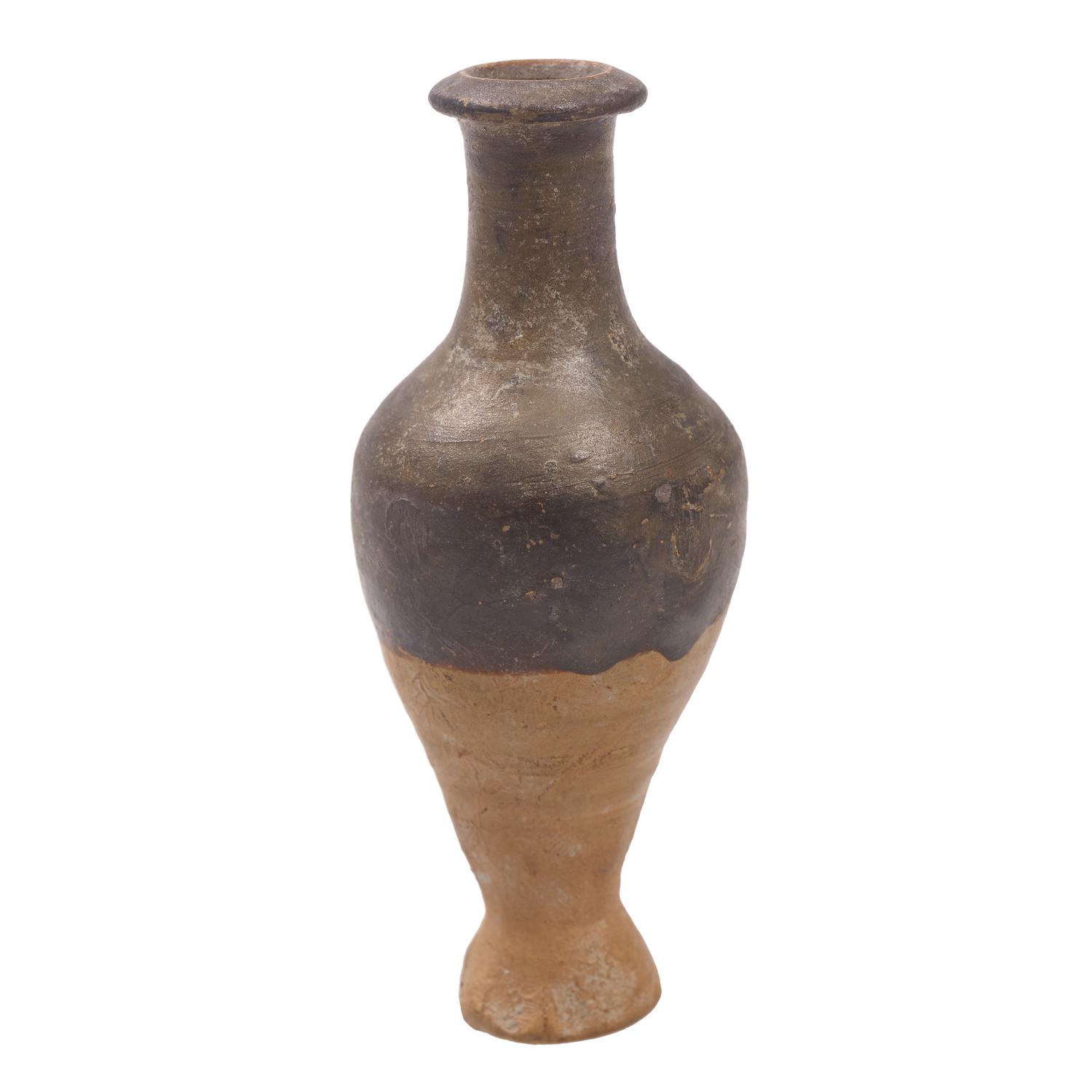 Unguentario fusiforme con piccolo labbro rovesciato, lungo collo cilindrico, corpo fusiforme, piede troncoconico; bocca e parte superiore del corpo verniciate in nero