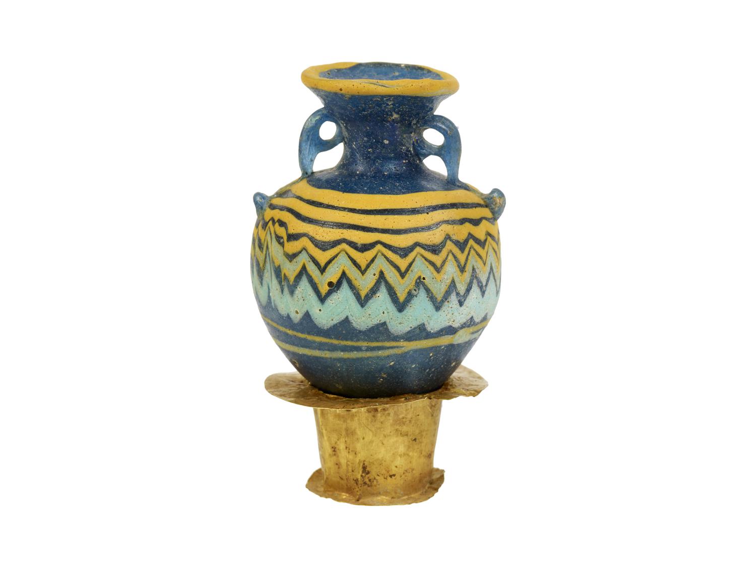 MATERIA E TECNICA: pasta vitrea blu, turchese e gialla, formato su nucleo friabile, lamina d'oro cesellata