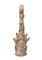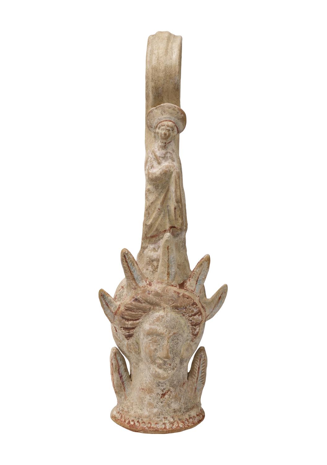 Testa femminile con viso allungato, capelli pettinati in ciocche parallele ai lati della fronte e raccolti da un sakkos ricamato a motivi cruciformi; la donna porta una stephane radiata a motivi fogliacei, orecchini circolari, collana dipinta in rosso e presenta due ulteriori foglie simmetrica alla base del collo. La testa è sormontata da un'ulteriore statuetta femminile con ampia corona a disco interamente panneggiata e appoggiata contro l'ansa
