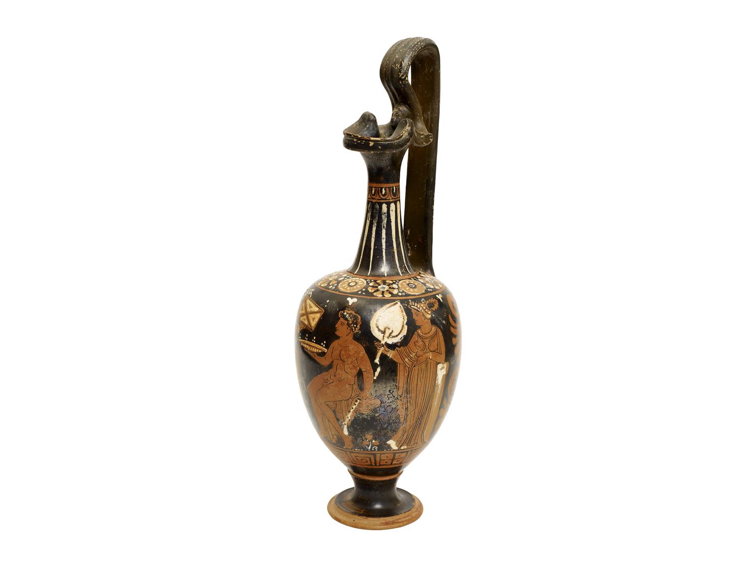 DECORAZIONE ACCESSORIA: interamente verniciata in nero; sul collo kyma ionico e falsa baccellatura, sulla spalla teoria di rosette, sotto la scena figurata meandro sinistrorso interrotto da motivo a scacchiera; sotto l'ansa grande palmetta aperta a ventaglio fra girali, volute e infiorescenze, bordo del piede risparmiato; agli attacchi superiore e inferiore dell'ansa protome femminile in rilievo