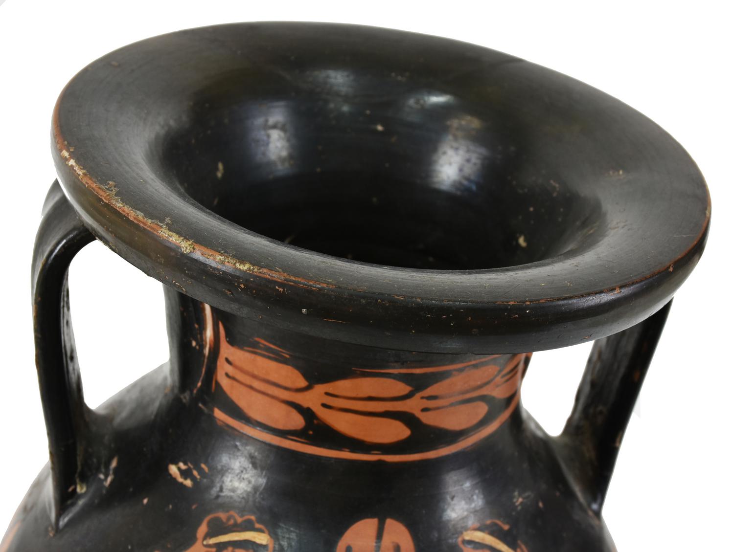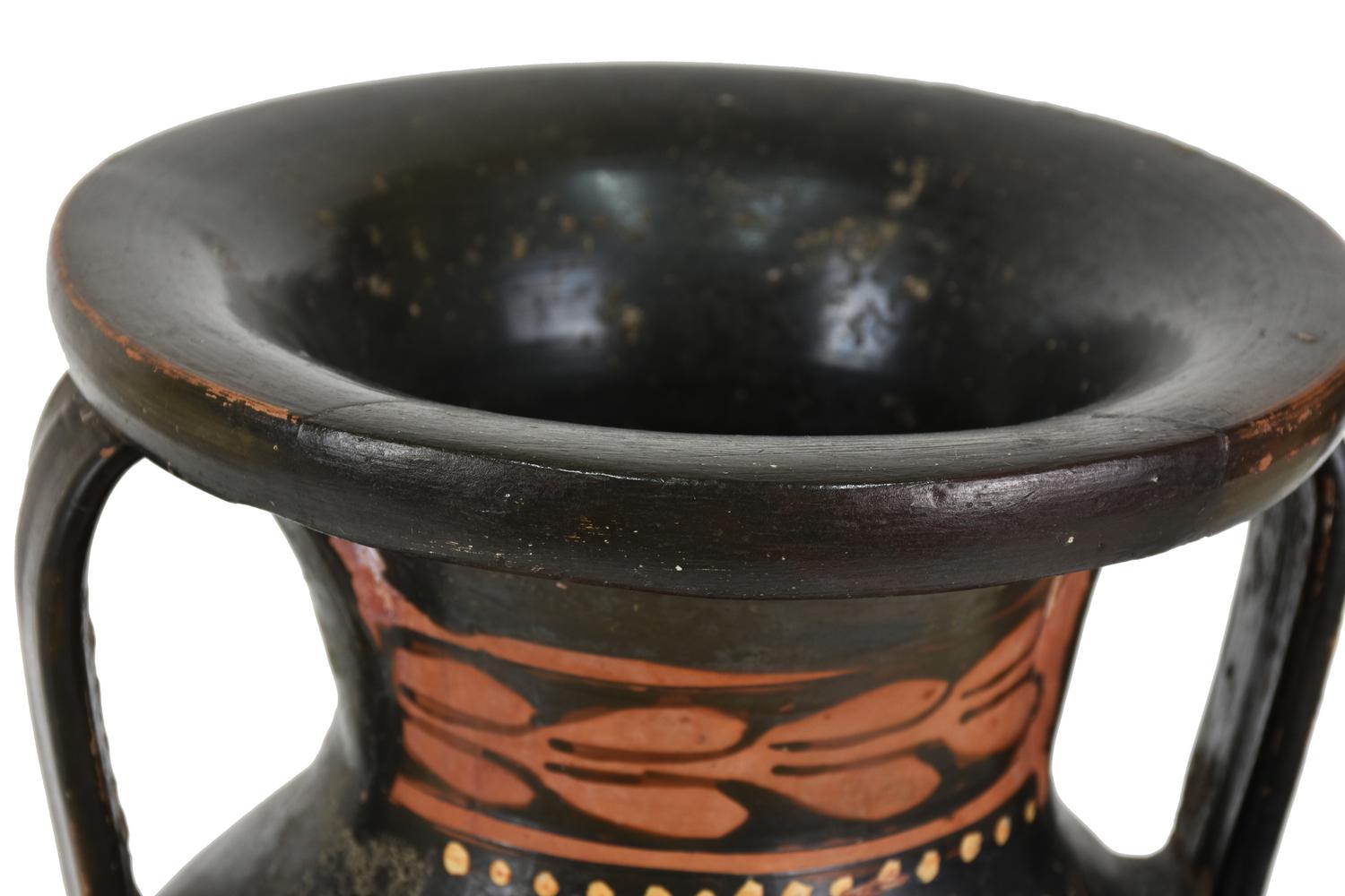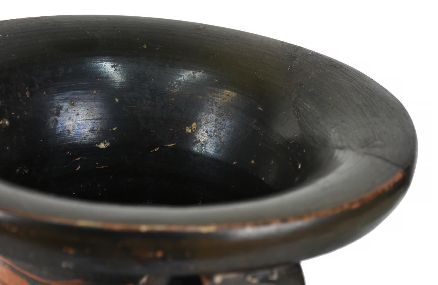 DECORAZIONE ACCESSORIA: interamente verniciata ad eccezione della parte inferiore all'attacco del piede; sopra le scene figurate tralcio di olivo orizzontale, sotto alle scene figurate meandro sinistrorso interrotto da motivo a croce di Sant'Andrea; sotto le anse grande palmetta aperta a ventaglio fra volute ed infiorescenze