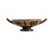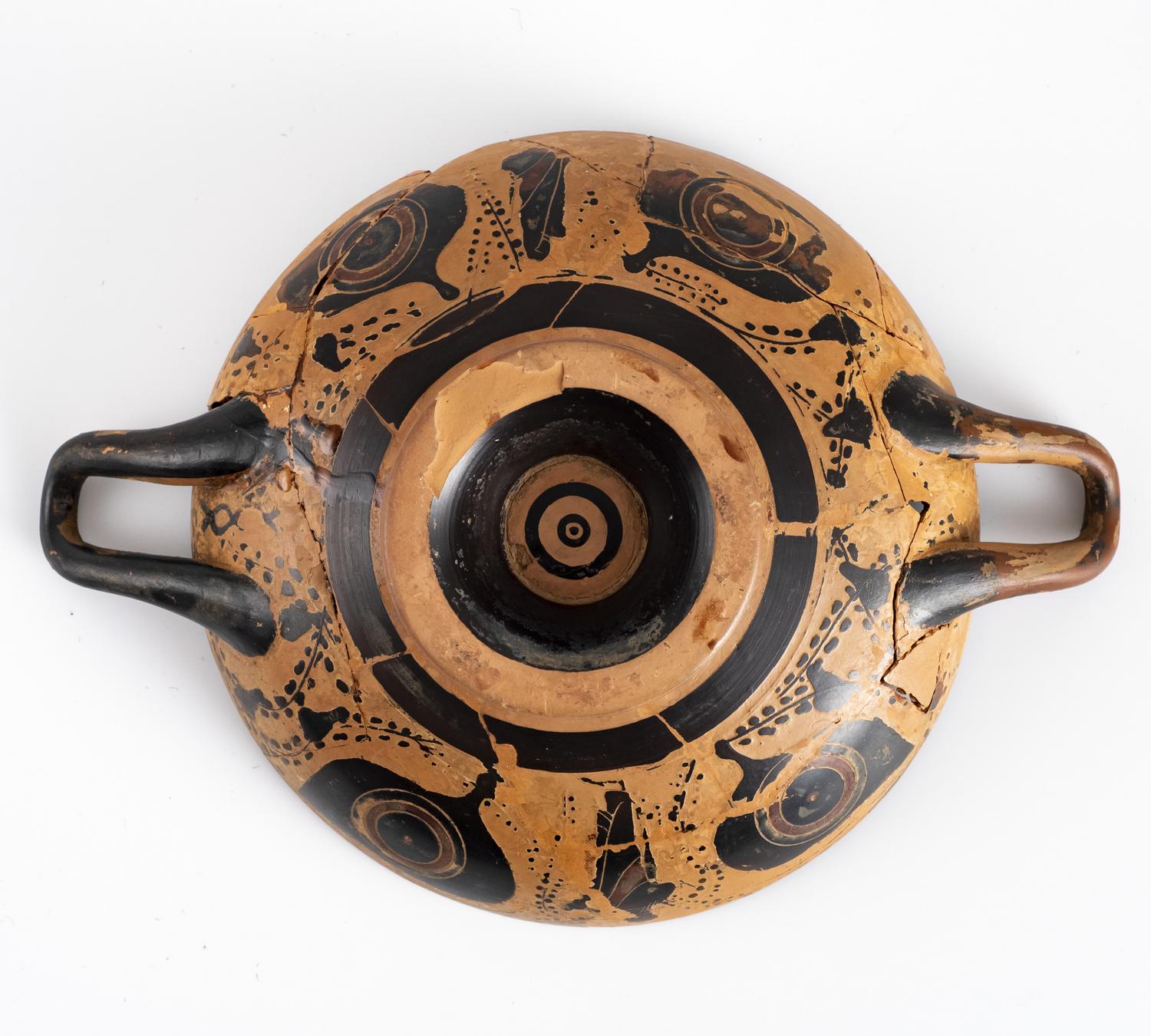 Decorazione: interno verniciato di nero, eccetto un filetto sul labbro ed il tondo al centro della vasca con con gorgoneion; esterno con decorazione identica sul lato A e B: al centro della composizione, fra i grandi occhioni, Dioniso stante a sinistra, completamente avvolto nel mantello, in atto di sollevare una coppa con la mano sinistra; nel campo pampini stilizzati ricurvi con foglie ridotte a puntini da cui pendono grappoli d'uva sotto alle anse