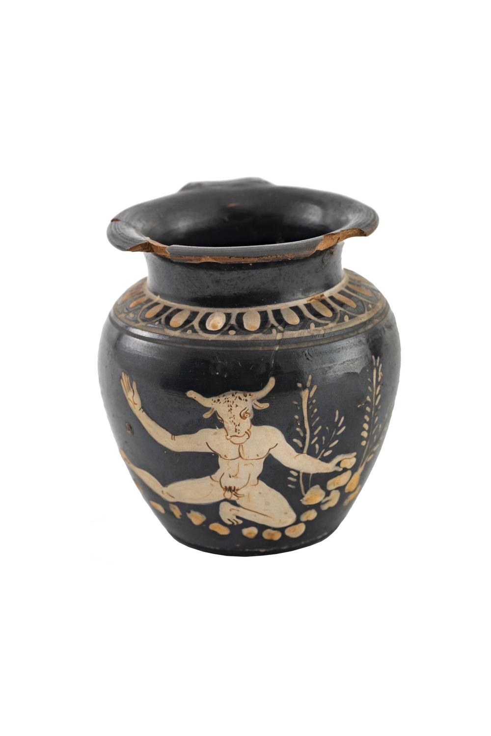 DECORAZIONE: sulla spalla kyma ionico; sul ventre grande figura di minotauro nudo in posizione frontale con le braccia aperte ed un sasso nella mano sinistra; nel campo arbusti e piccoli sassi