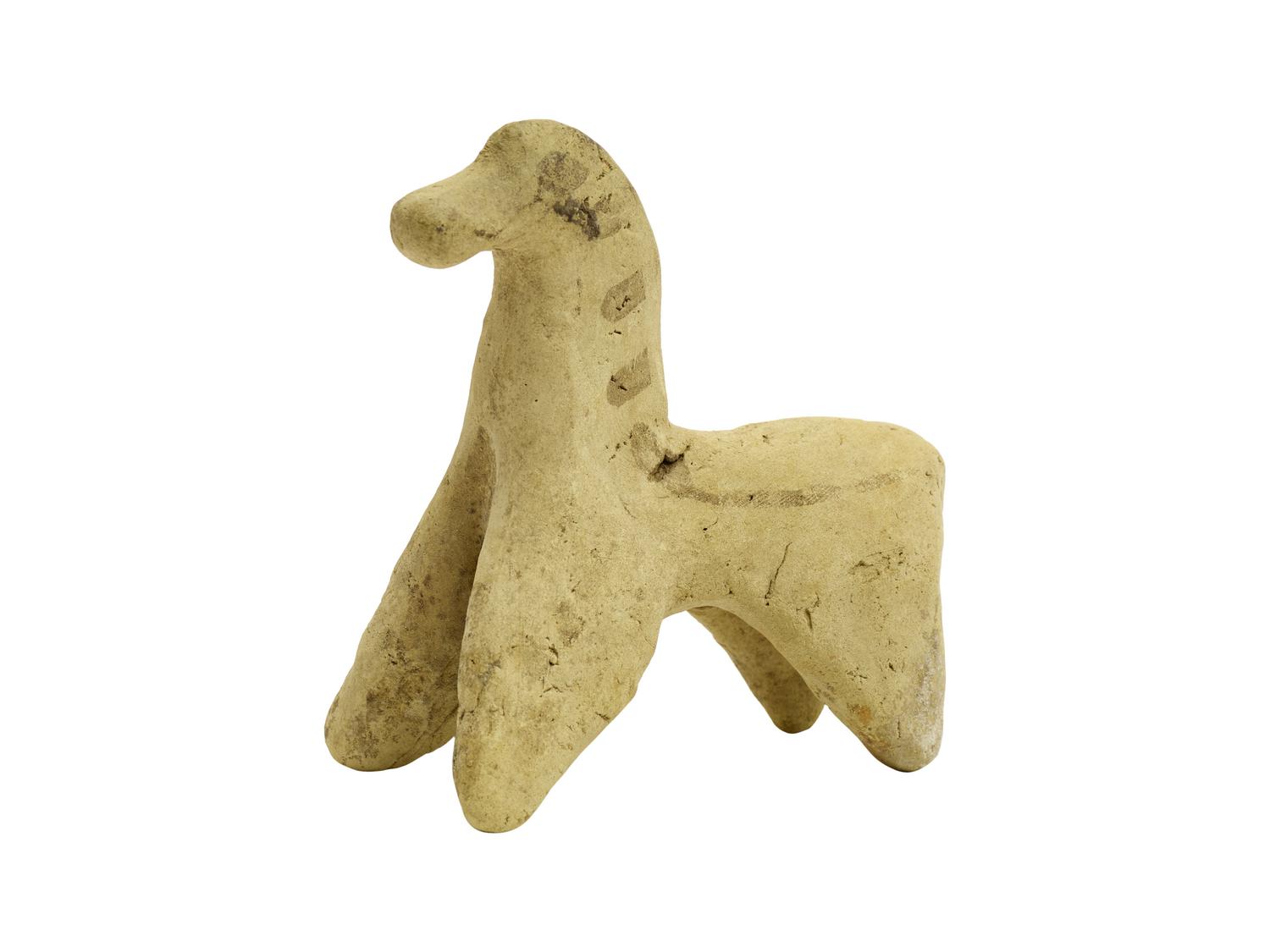 Statuetta stilizzata di cavallo in posizione stante, il collo eretto ed il muso tondeggiante, col pelame e la criniera resi a rapidi tratti in bruno